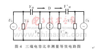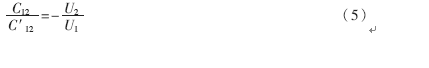 如果将两个三端电容串接起来,分别用两个信号源供电,就形成了如图4所示的等效电路,其中,Y12=jωC12,Y′12=jωC′12。在公共点D与接地端之间连接一个检流计,调节两个外加电压的幅值和相位,使通过两个直接电容流向D点的电流大小相等、方向相反,直道检流计指零,便可得到下面的关系式: