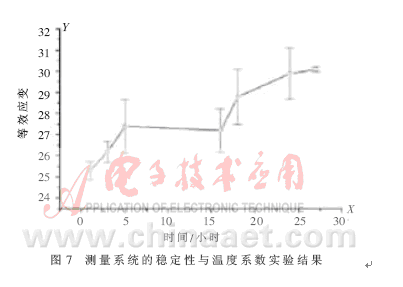 拟合方程显示在图中上部的方框里。从实验结果可看出,一微米位移可获得变压器电桥读数,变化为127.02,输出特性的非线性误差小于0.15%F.S.。比率臂第五档变化一个数对应的位移量根据传感器结构的不同,一般在5~8纳米之间,末级的数据采集器可获得300多毫伏的输出,从数据采集器便能够分辨出0.02纳米的变化。在实验室环境下,传感器测值随着温度的变化会产生极大的漂移,用标准元件来检查变压器电桥测量系统的温度系数与稳定性,所得结果见图7。在28小时的实验期间测值等效变化仅为0.1纳米,环境温度变化为3~4℃。作者还曾将差动电容式位移传感器放到100米深的钻井底部,那里温度的年变化不到0.03℃,整个位移测量系统月漂 移率仅为0.1纳米[3]。