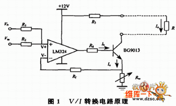 电压/电流转换即V/I转换,是将输入的电压信号转换成满足一定关系的电流信号,转换后的电流相当一个输出可调的恒流源,其输出电流应能够保持稳定而不会随负载的变化而变化。V/I转换原理如图1。