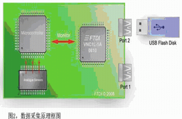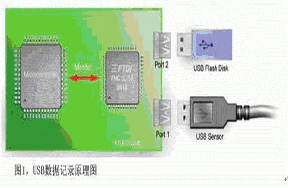 目前市场上有很多种数据采集设备可用于在PC上记录数据,如National Instrument的LabVIEW,不过这类设备的传感器件开始越来越多地采用USB接口而不是RS232或其他传统接口。过去在嵌入式系统中应用USB设备需要性能相对较强的硬件,要带有USB Host控制器接口、RTOS以及USB软件驱动,结果因USB Host功能实施成本的原因设计工程师一直都不太愿意在小型8位或16位MCU系统上增加USB设备。但随着最新一代智能USB Host控制器IC的推出,与MCU配合使用不仅可为PC应用使用USB数据采集设备,而且还可将数据存储在低成本高容量的闪存盘上。
