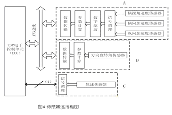 本文所作设计的框图如图4所示。在图中,方向盘转角传感器信号经微控制器处理后,通过CAN总线发送给ECU(图4中B);横摆角速度传感器、纵向/横向传感器由于信号特点和安装位置类似,故设计在同一个模块内(图4中A);由于ESP对轮速传感器信号的实时性要求较高,故经过信号调理后,直接送入ECU(图4中C)。在图4的A和B中,需要微处理器对信