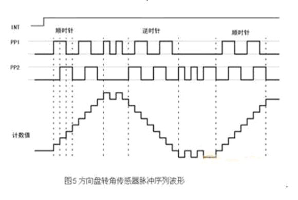 方向盘转角传感器的输出为正交编码脉冲。正交编码脉冲包含两个脉冲序列,有变化的频率和四分之一周期(90°)的固定相位偏移,如图5所示。通过检测2路信号的相位关系可以判断为顺时针方向和逆时针方向,并据此对信号进行加/减计数,从而得到当前的计数累计值,也即方向盘的绝对转角,而转角的变化率即角速度,则可通过信号频率测出。另外,方向盘转角传感器有一个零位输出信号,当方向盘在中间位置时,该信号输出0V,否则输出5V,通过该信号,可对绝对转角进行在线校准。