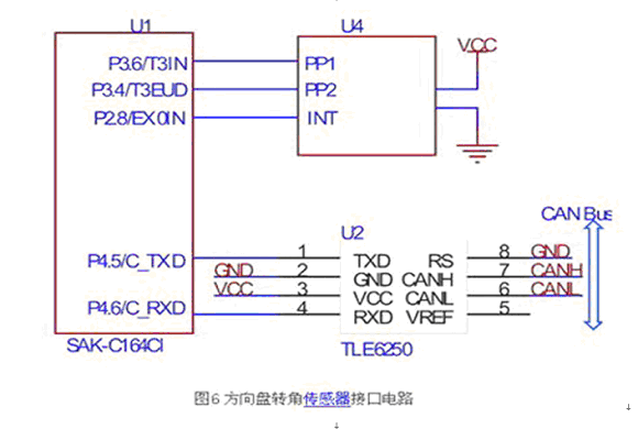 C164CI与方向盘转角传感器的接口电路如图6所示。片内内置增量编码的正交解码器,该解码器使用定时器3的两个引脚(T3IN、T3EUD)作为正交脉冲的输入,在正确设置相关寄存器后,定时器3的数据寄存器的值与方向盘转角成正比,故可方便的计算转角,本文所使用的方向盘转角传感器每一圈对应44个脉冲,设定时器3的数据寄存器为T3,则绝对转角为。