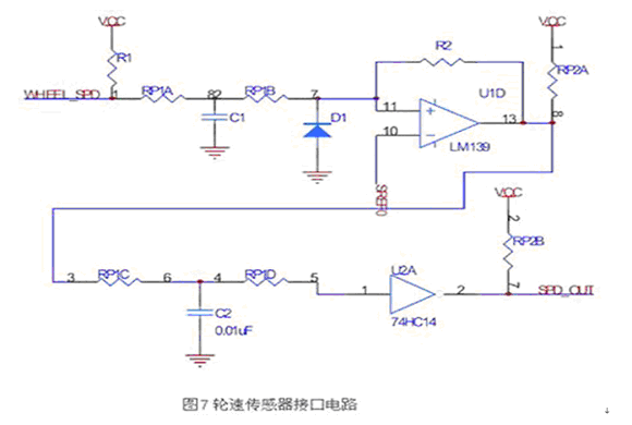 根据前面部分介绍的轮速传感器信号特点,设计接口电路如图7所示。
