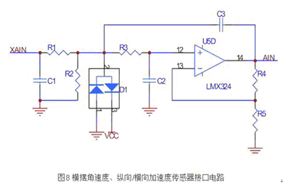横摆角速度、纵向/横向加速度传感器的安装位置基本相同,输出都是0V-5V的模拟量,由于汽车颠簸造成的信号波动特性一致,故封装在同一模块中。其硬件接口如图8所示,实现硬件模拟前置滤波,以抑制来自传感器的模拟信号中的高频噪声成分,防止在采样过程中出现混叠现象。运放使用满摆幅输出的LMX324。