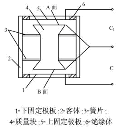 电容式加速度传感器的原理结构如图1所示,由图可见,它实际上是变极距差动电容式位移传感器,配接“m-k-c”系统构成的。质量块4由两根弹簧片3支撑于壳体2内,质量块4的A面与上固定极板5组成的电容C1,以及质量块4的B面与下固定极板1组成的电容C2。