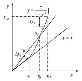 这是电容相对增量与极距相对增量之间的关系方程式。若采用线性特性方程y =x,如图4所示,显然其线性误差较大。为此可采用线性特性方程y=(1+ε)x,并使其在最大量程xM 处产生的正误差ΔyM 及其x1在处产生的负误差Δy1在数值上相等,即: