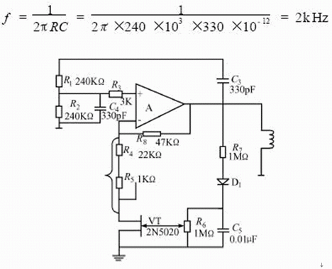 由于放大器的输出电阻很低,反馈信号加入运算放大的同相输入端,所以输入电阻很高,这样同相放大器的增益KF=1+ R8/Rf,仅与外部电阻R8和Rf有关,而与放大器本身参数无关,因此增益的精度和稳定性都很高。在实际应用中,常选RC串-并联电路的R1=R2=R,C1=C2=C,所以在f=1/2πRC这个频率上, RC移相网络相位移为零,而R8≈2Rf,满足振荡条件。选R=240kΩ, C=330pF,则得到振荡频率为: