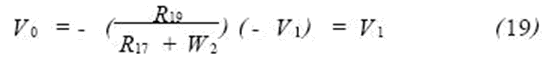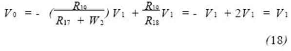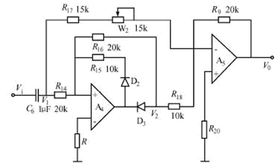 当输入电压Vi 为正半周期时,经耦合电容C6的电压V1(即Vi =V1)输入给A4反相,D2截至,D3导通,A4的电压放大倍数为R16/R14=-1,即V1=-V2;调整W2,R17=R19=20kΩ ,经R17和W2送来的A5的输入信号为V1,另一路经A5的输入信号为V2,则输出信号为: