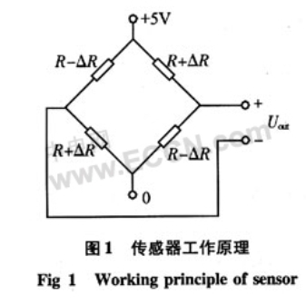整个传感器最关键的部分是其中的惠斯通电桥。当外加磁场后,电桥的电阻变化,如图1所示,引起传感器输出电压Uout变化Uout=(△R/R)Ub,式中 Ub为传感器工作电压。
