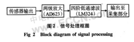 前端信号处理电路由仪表放大器、四阶巴特沃思低通滤波器等部分构成,其基本框图如图2所示。