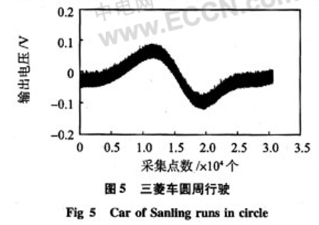 直线法和圆周法比较可以看出:图5、图3、图4中的曲线变化规律明显不同,曲线形状变化较大是因为目标运动方式不同,即影响磁场的方式不同,从而测得曲线有差别,图5曲线中有个较大的峰值,是因为车在圆周行驶时,在采集信号期间车有一次通过传感器敏感轴的正方向。另外,由于采集时间有限,所以,曲线没有反映信号周期性变化,若采集时间达到2个周期,则会出现2个主峰。