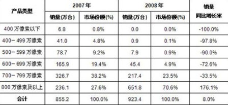 由于技术不断升级,2008年数码相机的像素进一步升级。虽然数码相机总体市场保持了较为温和的增长,但是不同像素类型的数码相机增长幅度不尽相同。其中,800万像素以上的数码相机同比2007年有176.1%的增长;而800万像素以下的所有数码相机产品都出现了不同程度的下滑。其中400万像素以下的数码相机则完全退出市场。