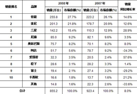 2008年,佳能进一步保持并巩固其销售量市场第一的领先地位,市场占比达到27.7%,Sony继续保持中国数码相机市场的第二名的位置,在其突出的产品攻势下,市场份额有所上升。三星、尼康和奥林巴斯,分别进入中国数码相机市场的前五名。
