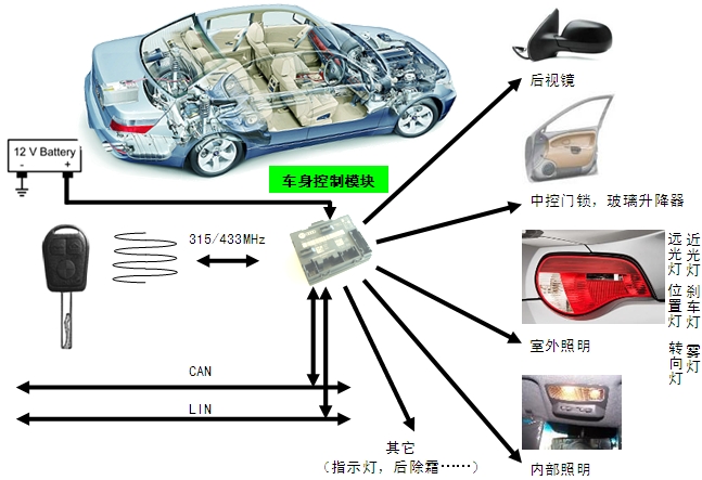 汽车中的遥控上锁及开锁的应用越来越普及。车身控制??槭褂?15 MHz(美国、日本)或433MHz(欧洲)频率,通过高频接收和发送来实现??厣纤翱δ?。