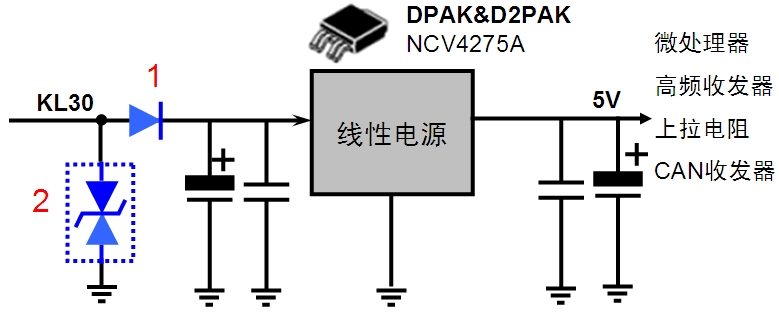 NCV4275A是一款带复位和延迟功能的5 V、3.3 V/450 mA低压降(LDO)线性稳压器,这款器件支持可编程微控制器复位,并提供多种特性,如过流?;ぁ⒐卤;?、短路?;さ取4送?,在下图中位置1处串联一个二极管(MRA4005),这线性电源能有效防止高达-42 V的反向电压。