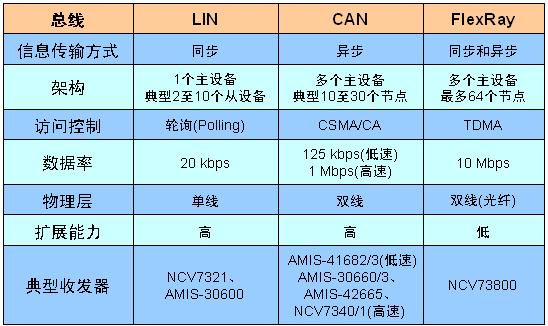 可以应用于汽车中的系统总线有多种,如控制器区域网络(CAN)、本地互连网络(LIN)及FelxRay等。这些总线的特点各不相同,表1比较了汽车应用中几种常见的系统总线,并列出了典型的安森美半导体总线收发器产品。