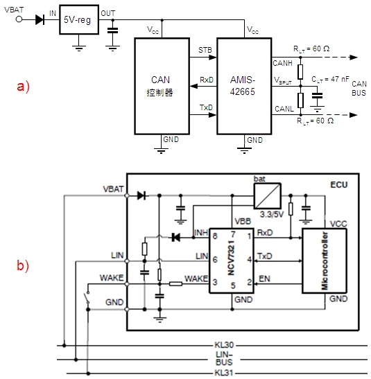 图3:基于安森美半导体收发器的典型CAN电路(图a)及LIN电路(图b)。