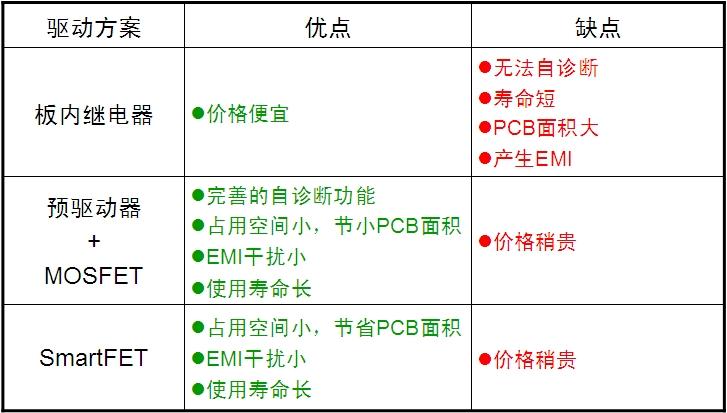 第三种方案是采用SmartFET驱动。这是带?;さ腗OSFET,在MOSFET基础上增加了多种功能,如过压钳位、ESD?;?、过流?;?、过温保护、反压?;ぜ案弑吆偷捅咔5湫推骷绲捅咔腘CV8401/2/3,及用于高边驱动(内部集成了升压电路)的NCV8450和NCV8460等。这三种方案的优缺点见表2。