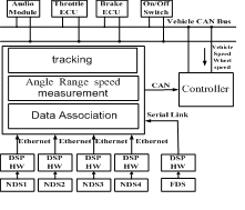 数据融合系统采用分布式体系结构,即每个近距离传感器对获得的回波信号先进行局部处理,然后送入融合中心进行融合以获得目标的方位、速度信息。控制器是整个雷达网络系统的最终决策机构,它负责识别目标的距离和速度信息是否对行车安全构成威胁,并通过声光的形式提示驾驶员或者直接作用于车载控制系统加以调整。