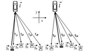 对于本文所讨论的雷达网络系统而言,四个近距离雷达传感器即是发射机又是接收机。如图6所示,通过电扫开关的控制,其中的一个NDS担当发射机,反射信号被四个NDS同时接收。经过信号处理之后,因各个NDS之间位置的不同,可以得到四组关于被测目标的距离和相对速度值(r1,1v1,1)、(r1,2v1,2)、(r1,3v1,3)、(r1,4v1,4)。这种采用单基地发射多基地接收的雷达网络体制,尽管对传感器之间的时间同步控制要求很高,但是可以避免邻近传感器之间的相互干扰。