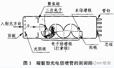 光电倍增管是一种真空器件。它由光电发射阴极(光阴极)和聚焦电极、电子倍增极及电子收集极(阳极)等组成。典型的光电倍增管按入射光接收方式可分为端窗式和侧窗式两种类型。图1所示为端窗型光电倍增管的剖面结构图。其主要工作过程如下:
