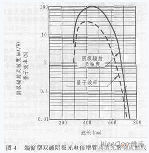 光电倍增管由阴极收入射光子的能量并将其转换为光子,其转换效率(阴极灵敏度)随入射光的波长而变。这种光阴极灵敏度与入射光波长之间的关系叫做光谱响应特性。图4给出了双碱光电倍增管(其光阴极材料为Sb-Rb-Cs和Sb-K-Cs)的典型光谱响应曲线。