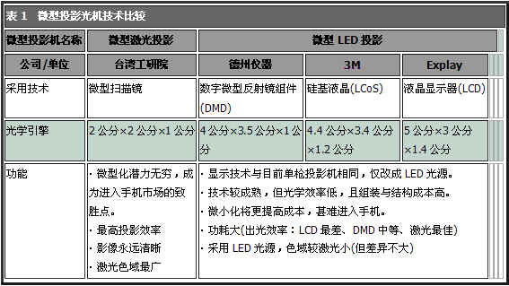 由于便携式装置内建微型投影机风潮兴起,市场对于微型投影机的尺寸要求更加严苛。有业内人士表示,相比发光二极管(LED)光源微型投影技术(表1),激光微型投影具有无限焦距、光机体积小、色彩饱和度高、低耗能等特性,后势深具潜力。