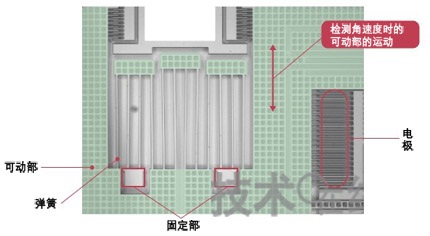 新传感器由MEMS中常见的固定部、可动部、连接固定部与可动部的弹簧,以及检测可动部运动的电极构成。利用电极静电容量随着可动部的运动而发生变化的特性来检测角速度和加速度(图2)。检测角速度的电极只有在弯道等使车辆转向时才检测信号。