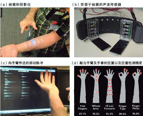 Harrison等通过关注声波脉冲的波形及强度因敲击手臂及手掌的部位不同而发生变化这一点,还开发出了根据该波形信息等通知敲击的是手臂哪一部位的软件。“如果是手臂及手掌的固定部位,20次操作中,错误不到1次。其错误率与iPhone的触摸面板相当”(Harrison)。