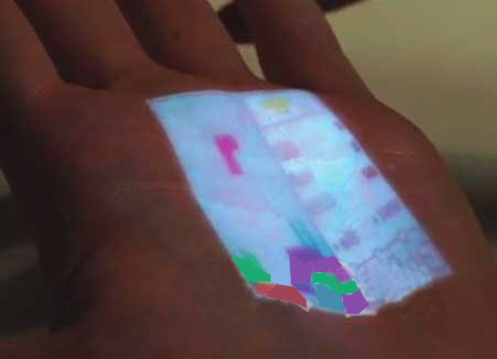 Skinput还将显示器功能单独分割出来。具体实现方法是,利用小型投影仪,将手掌及手臂作为显示器使用(右上方的图片)。