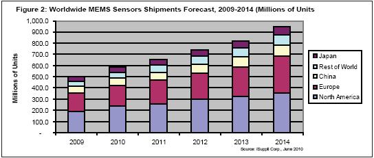预计2010年全球汽车MEMS传感器出货量将达到5.912亿个,比2009年的5.020亿劲增17.8%。2009年MEMS传感器市场剧烈波动,年初的时候由于经济衰退的影响,传感器公司的订单几乎枯竭,但第四季度出货量迅速上升,甚至超过了2007年创下的高点。iSuppli公司的数据显示,2010年该市场刚刚恢复元气,将开始一段繁荣时期,至少会持续到2014年的预测期终点。