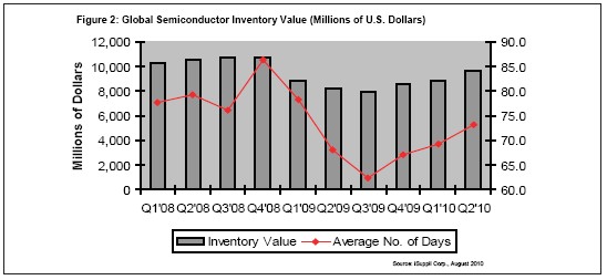 图2所示为iSuppli公司对于2008年第一季度到2010年第二季度的半导体库存价值的预测,分别以美元和库存天数计量。
