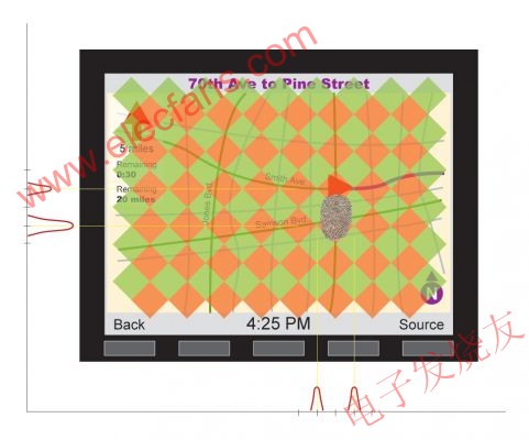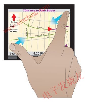 通过比较当前基于电阻式触摸屏和带手势识别的电容式触摸屏的汽车HMI概念,我们可以发现,新增手势识别功能后,驾驶人员对路面的关注程度在某些方面有所改善。通过电容式触摸屏的手势识别不仅是一种新的输入方式,更使系统输入提升到了一个新的层次。采用电容式触摸屏,驾驶人员仍然可以通过点击浏览菜单结构,滑动手指提高音量或者调节HVAC风扇速度。不过,真正重要的是其控制标准功能的简易度,比如控制驾驶过程中非常必要的导航功能。用户不必紧盯着屏幕,只需一个简单的手势即可实现缩小操作。屏幕上的任何区域都可以感知手势,因此驾驶人员不必把手指放在特定的位置来完成操作。图1显示就是这种导航屏幕上的动作感知说明。