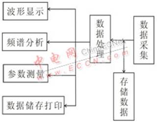本虚拟软件将有关测试功能集成在一个面板上,这里着重介绍LabVIEW的框图程序设计??蛲汲绦蚴切槟庖瞧鞯暮诵牟糠郑槟馐静ㄆ饕瞧髦饕伤赐瓿墒莸牟杉?、处理和显示。本系统框图程序主要包括数据采集、波形显示、参数测量、频谱分析和波形存储及回放等5大功能模块,如图3示。