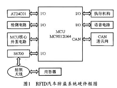 RFID系统为该汽车防盗系统的核心组成部分。一般由标签(TAG,即射频卡)、阅读器、射频天线三部分组成。标签由耦合元件及芯片组成,含有内置天线,用于和射频天线间通讯;阅读器用于读取(在读写卡中还可以写入)标签信息;射频天线用于在标签和读取器间传递射频信号。