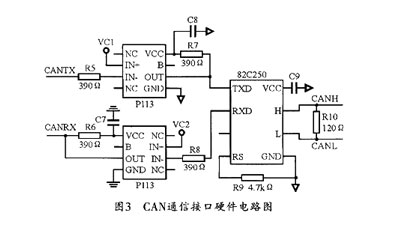 CAN通讯网络??楦涸鸾舳藕藕图觳庑藕磐ü鼵AN网传输给汽车的中央处理器。中央处理器通过接收的信号做决策判断。CAN总线通信方式灵活、抗干扰能力强,目前在汽车控制系统中应用广泛。CAN通讯接口硬件设计如图3所示,其中82C250是CAN控制器和物理总线间的接口,它和CAN控制器之间采用光隔P113来提高系统的抗干扰能力。