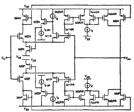 因此,这种缓冲器的工作过程可以这样详细描述如下:当输入信号Vin,在中部电源电压区,两个输入对MIP~M2P和MlN—M2N是有效的,M4P-M5P和M4N--M5N镜像一个等于IB的电流到输出支路。而且,电流IB的复制品通过晶体管MIPR(M1NR)和M2PR—M3PR(MlNR—M2NR)拷贝,给输出支路底部的附加电路的电流源提供电流。因此,晶体管M4P和M5P(M4N和M5N)关断,而且对输出电流没有任何贡献。输入信号接近VDD时,PMOS输入对关断,而且反相输入支路的复制品等等都关断。MIPR--M3PR不对输出支路的附加电路发送任何电流。这样的话,M4PR和M5PR导通,从输出支路吸收等于IB的电流,维持缓冲器是导通的。当输入信号Vin接近VSS时,类似的情况也会发生。