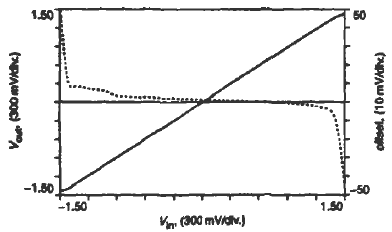 在中部电源电压区,PMOS和NMOS输入对是有效的,而且它们的偏置电流通过电流镜M4P--M5P和M4N--M5N镜像到该电路的输出端。这种结构允许NMOS输入对驱动在电源电压区的输出节点接近VDD.而PMOS控制输出端的电压范围接近VSS.不幸的是,在接近VDD时,P沟道输入对截止,而且没有电流被镜像到输出端的底部,关闭了缓冲器。类似的情况是VSS时.N沟道差分对不是有效的。为了这个原因,晶体管M1PR-M5PR和MlNR-M5NR已包括在图2中,维持在整个电压范围内是有效的。