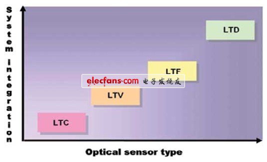 一旦根据转换类型、速率以及光谱响应缩小了选择范围,最后的选择就要基于其他标准,比如封装类型、温度范围,当然还有成本。典型的工作温度范围是商用(0~70℃),工业用(-40~85℃),汽车(-40~105℃)以及军用(-55~125℃)通常,成本与硅的尺寸成正比。并且,硅基尺寸越大,成本越高。光的应用倾向于更高的系统集成,见图1,集成度越高,传感器的复杂度越高,但各部件对应用所起的作用却越低。