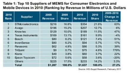 2010年TriQuint在该领域的营业收入剧增778.6%,达到7470万美元,而2009年只有区区850万美元。TriQuint在该市场的排名因而从2009年的第16窜升至第8。意法半导体在10大厂商中的增长率排名第二,其营业收入大增63.5%,从2009年的2.163亿美元上升到3.536亿美元,扩大了在全球消费与移动MEMS销售额方面的领先优势。