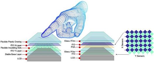 阻性触摸屏包括有一个柔性顶层,然后是一层ITO,一个空气隙,然后是另一层ITO。面板有4根线附到ITO层上:“X”层的左右侧各一根,“Y”层的顶端和底端各一根。