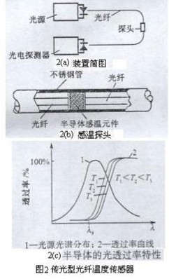 位图2(a)为半导体吸光型(传光型)光纤温度传感器示意图。将一根切断的光导纤维装在细钢管内,光纤两端面间夹有一块半导体感温薄片(如GaAs或InP),这种半导体感温薄片透射光强随被测温度而变化。因此,当光纤一端输入一恒定光强的光时,由于半导体感温薄片透射能力随温度变化,光纤另一端接收元件所接受的光强也随被测温度而改变。于是通过测量光探测器输出的电量,便能遥测到感温探头2(b)处的温度。