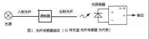 光纤传感器一般是由光源、接口、光导纤维、光调制机构、光电探测器和信号处理系统等部分组成。来自光源的光线,通过接口进入光纤,然后将检测的参数调制成幅度、相位、色彩或偏振信息,最后利用微处理器进行信息处理。概括光纤传感器一般由三部分组成,除光纤之外,还必须有光源和光探测器两个重要部件,见图1所示。