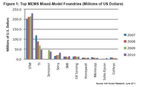 - 意法半导体2010年MEMS制造服务营业收入为2.286亿美元