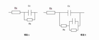 在模型A中电阻器Rs表示金属所在的溶液,而电容Cc表示金属表面的保护涂层或涂料,这表示初始涂层的电容。经过一段时间后,水渗入涂层中形成新的液体和金属界面。随着金属的腐蚀,通过溶液与金属之间的?;ね坎阈纬衫胱拥嫉缏肪?。这可以用Rx与Cc并联模型来表示。另外,有些模型(模型B)还有一个附加的R和C并联起来再与Rx串联的电路来表示金属?;ね坎闼孀攀奔浔浠姆植隳P汀?br />