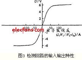 检测回路的输入输出特性见图3。补偿回路开环特性随着直流磁势的增加趋于饱和,由于一次被测直流磁势绝大部分被二次直流磁势自动平衡掉,剩余磁势很小,补偿回路的开环特性可近似看成一条过原点的直线。以(I1W1/W2-I2s)为横坐标x,以U为纵坐标y,可得:y=0.14461x。