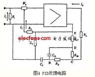 输出的电流经过运算放大及驱动环节得到所需的补偿电流磁势I2eWe,运算放大环节在自动控制系统中属于比例控制。比例控制的最大缺点是存在余差,当对控制质量有更高要求时,就需要在比例控制基础上,再加上能消除余差的积分控制作用。微分控制系统中即使偏差很小,只要出现变化趋势,就可马上进行控制,有超前控制的特点,因此本文在差值电流补偿回路中采用PID控制器。PID反馈电路如图4所示,它既能快速进行控制,又能消除余差,具有较好的控制性能。比例积分微分控制规律为: