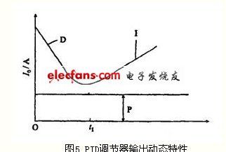 PID运算电路的工作过程如下:当输入信号Ii有一阶跃变化时,一开始CD、C1,相当于短路,输入信号突跳至微分作用最大值。继而随着对CD的充电,负反馈电压逐渐升高,输出电流I0逐渐衰减下来。与此同时,CI也被充电,随着CI两端电压逐渐增加,负反馈作用逐渐减小,输出电流I0又慢慢上升。在Ii阶跃作用下,PID输出特性曲线见图5。