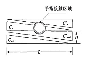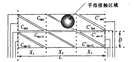 Ca(n)、Cb(n)、为第一组感应电极,Cb(n)、Cb(n)''''为第二组感应电极,Ca(n)''''、Cb(n)''''为第三组感应电极,分别感应X1、X2、X3范围内坐标点的位置。具体坐标计算方法与上述类似。设计中需要注意X1、X2、X3每组电极的宽度应与手指接触面积的宽度相当,如宽度不足则需要增加菱形电极,否则手指接触在相同区域内无法识别两个感应点。